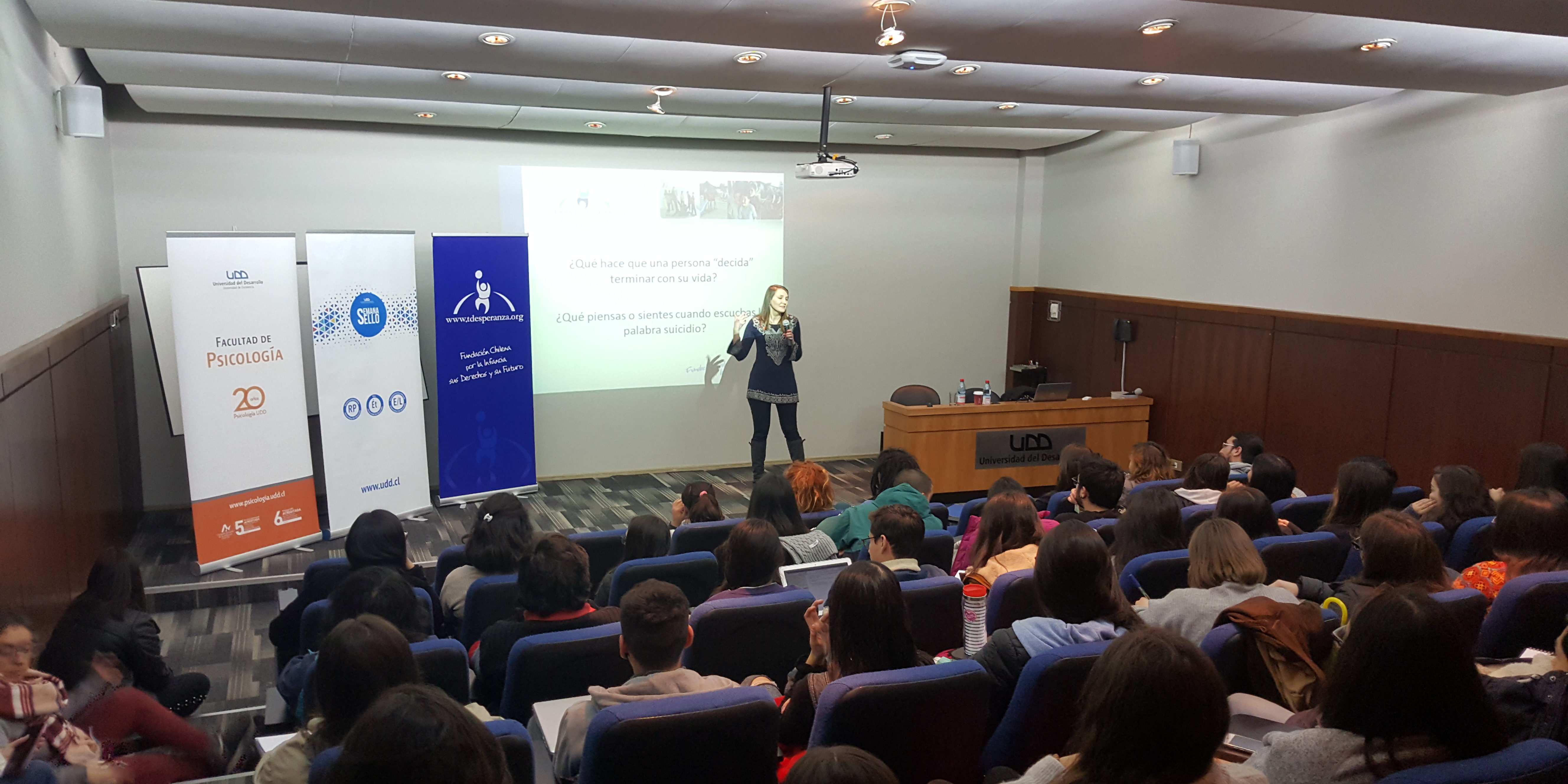 Fueron cerca de 80 alumnos de la Universidad del Desarrollo los que asistieron a la charla Rol de la sociedad en la prevención del comportamiento suicida en niños, niñas y jóvenes”, impartida por Tamara Cumsille Manríquez, psicóloga y coordinadora técnica de la Fundación Tierra de Esperanza.